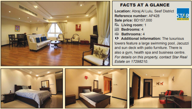 A fully-furnished four bedroom apartment is up for sale in Abraj Al Lulu’s luxurious Black Tower boasting views of Harbour Towers and the sea.